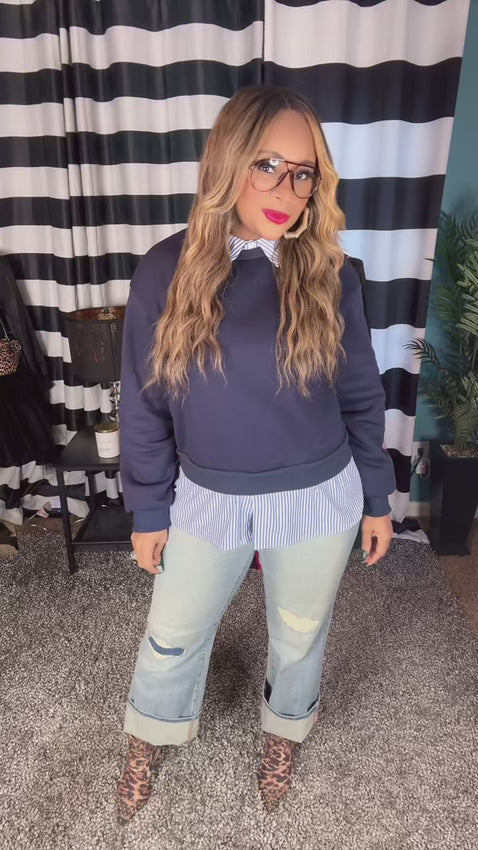 This navy blue sweater features a clever built-in illusion of a crisp white collared shirt with blue stripes peeking through at the collar, cuffs, and hem—creating depth and visual interest without the bulk of actual layering.